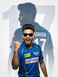 A high-quality sports poster featuring a young South Asian man with quiff-style, wearing rectangular black sunglasses. He is dressed in a (Lucknow Super Giants (LSG) new cricket jersey. The design uses a powerful double exposure effect: in the foreground he is captured mid-shout in an intense, triumphant celebration with a clenched fist; in the background, a larger, faded silhouette of him is shown from behind, displaying the name "Ashish" and the jersey number "17". The background is a cdean, textured light gray with a large, subtle "17" watermark, Cinematic lighting, dramatic contrast, sharp focus, ultra-detailed 8K resolution, professional sports poster graphic design style, 1O0% my face same, I need this prompt picture.
