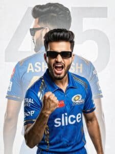 A high-quality sports poster featuring a young South Asian man with quiff-style, wearing rectangular black sunglasses. He is dressed in a (mumbai indians (mi) new cricket jersey. The design uses a powerful double exposure effect: in the foreground, he is captured mid-shout nanintense, triunmphant celebration with aclenched fsts 血he background, alarger, faded silhouette of him is shown from behind, displaying the name"ASHISH and the jersey number "45". The background is a cdean, textured light gray with a large, subtle "45" watermark. Cinematic lighting, dramatic contrast, sharp focus, ultra detailed 8K resolution, professional sports poster graphịc design style, 100% my face same, I need this prompt picture.