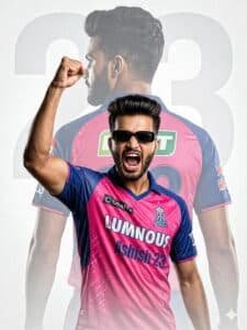 A high-quality sports poster featuring a young South Asian man with quiff-style, wearing rectangular black sunglasses. He is dressed in a (Rajasthan Royals (RR) new cricket jersey. The design uses a powerful double exposure effect: in the foreground, he is captured mid-shout in an intense, triumphant celebration with a clenched fist; in the background, a larger, faded silhouette of him is shown from behind, displaying the name "Ashish" and the jersey number "23". The background is a dean, textured light gray with a large, subtle "23" watermark. Cinematic lighting, dramatic contrast, sharp focus, ultra-detailed 8K resolution, professional sports poster graphic design style, 100% my face same, I need this prompt picture.