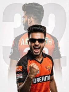 A high-quality sports poster featuring a young South Asian man with quiff-style, wearing rectangular black sunglasses. He is dressed in a (Sunrisers Hyderabad (SRH) new cricket jersey. The design uses a powerful double exposure effect: in the foreground, he is captured mid-shout in an intense, triumphant celebration with a clenched fist; in the background, a larger, faded silhouette of him is shown from behind, displaying the name "Ashish and the jersey number "32". The background is a clean, textured light gray with a large, subtle "32" watermark. Cinematic lighting, dramatic contrast, sharp focus, ultra-detailed 8K resolution, professional sports poster graphic design style, 100% my face same, I need this prompt picture,