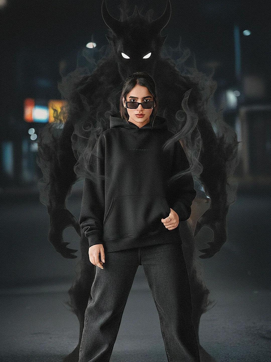 Keep face 100% original and unchanged no face reshaping no beauty filter no Al facial modification preserve real skin texture facial features expression and identity exactly as original aspect ratio 3:4 black oversized hoodie with minimal text detail loose black wide-leg pants dark sneakers black luxury sunglasses all-black streetwear aesthetic no outfit change same fabric texture head raised straight eyes staring directly into the camera one hand relaxed near pocket other hand slightly clenched shoulders squared body facing forward strong grounded stance sharp intense eyes slight smirk or neutral dominant face no smile emotion fearless powerful unbreakable massive black smoke demon standing directly behind demon's glowing white eyes aligned just above the woman's head smoke slowly wrapping around shoulders and arms